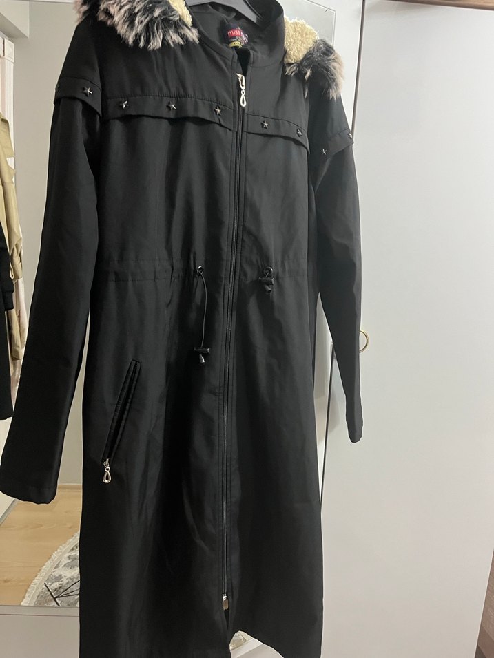 Uzun siyah kadın ceketi, regular fit ve kesik yaka detayına sahiptir. Uzun kollu ve kürklü kapüşonludur, günlük sokak stiline uygundur. Fermuarlı cepler ve belden bağlama ipi bulunur. Yumuşak ve sıcak kumaştan üretilmiştir. Tesettür için uygundur 44 bedendir