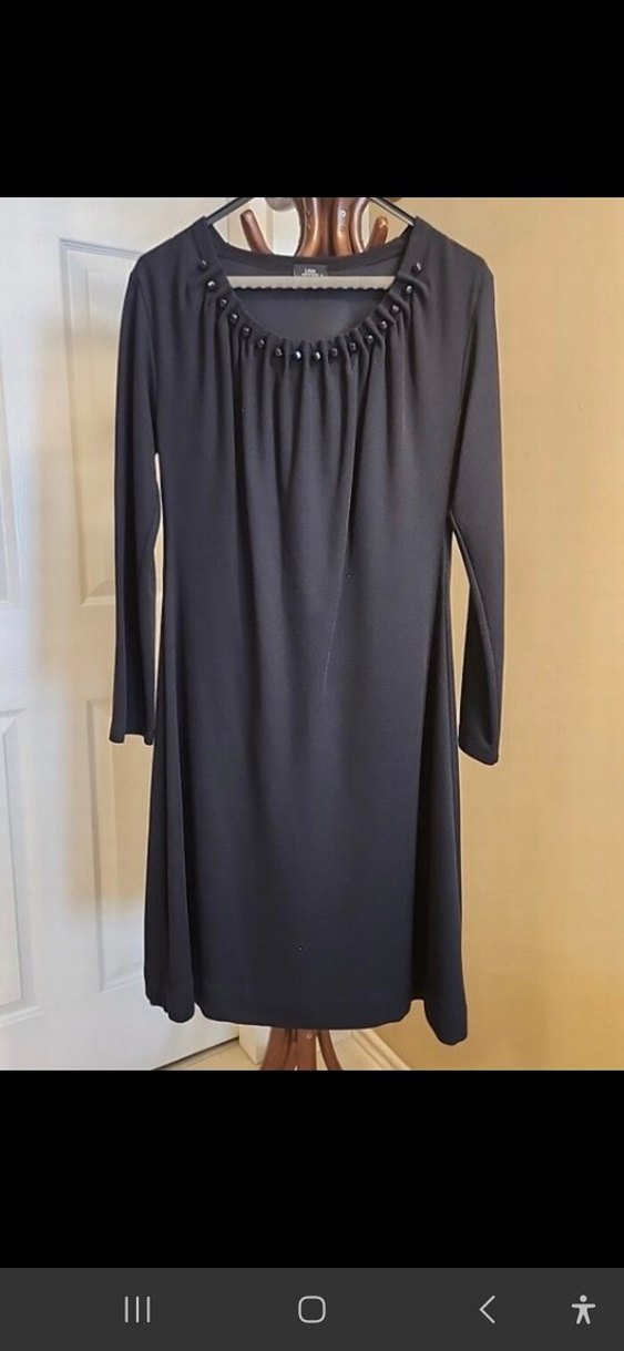 Uzun siyah elbise, tek parça ve desensiz. Kayık yaka, drapeli detaylı ve uzun kolludur. Bol kesim, minimalist goth tarzda, klasik şıklık sunar.