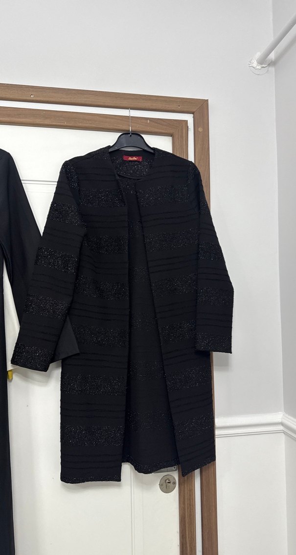 Uzun siyah kadın kaban, notalı yaka ve uzun kollu, modern bir dokunuş için yırtmaçlı. Ofis ve sokak tarzı için uygun.