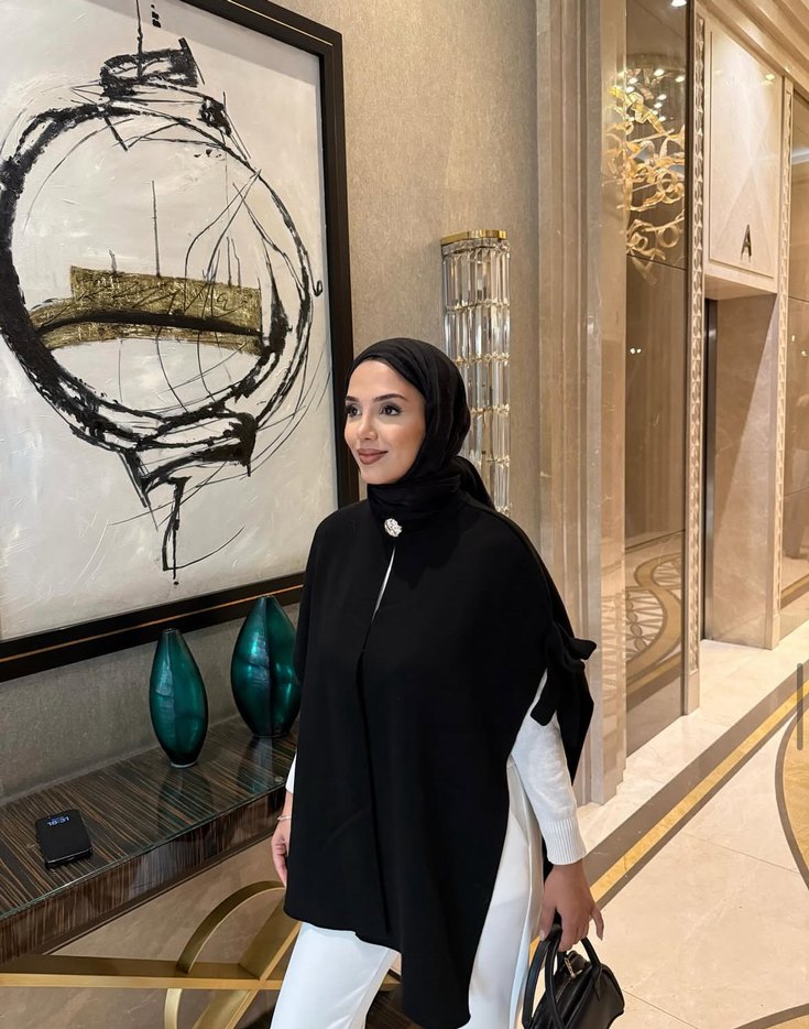 Uzun siyah kadın panço, yüksek yakalı ve uzun kollu, dökümlü kesimlidir. Sentetik kumaştan üretilmiş, etnik desenlidir, minimalist sokak modasına uygundur.