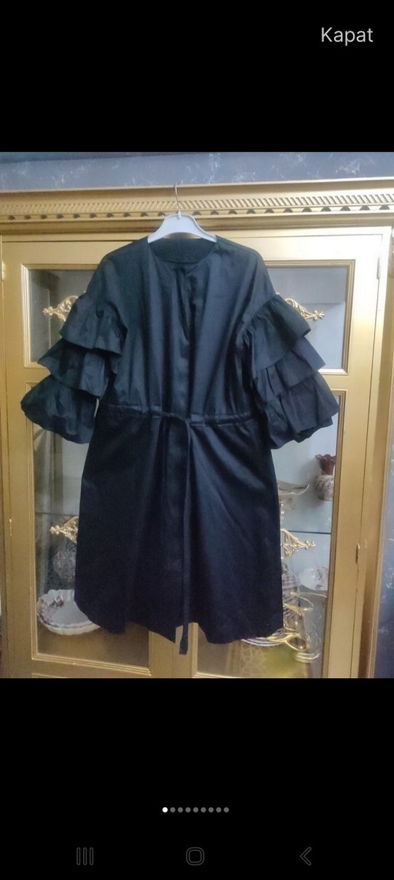 Bu uzun siyah kadın pelerin, bol kesim ve kat kat fırfırlı kollara sahip, sentetik kumaştan yapılmış ve yakası kesik detaylıdır. Ofis için gotik tarzda uygundur.