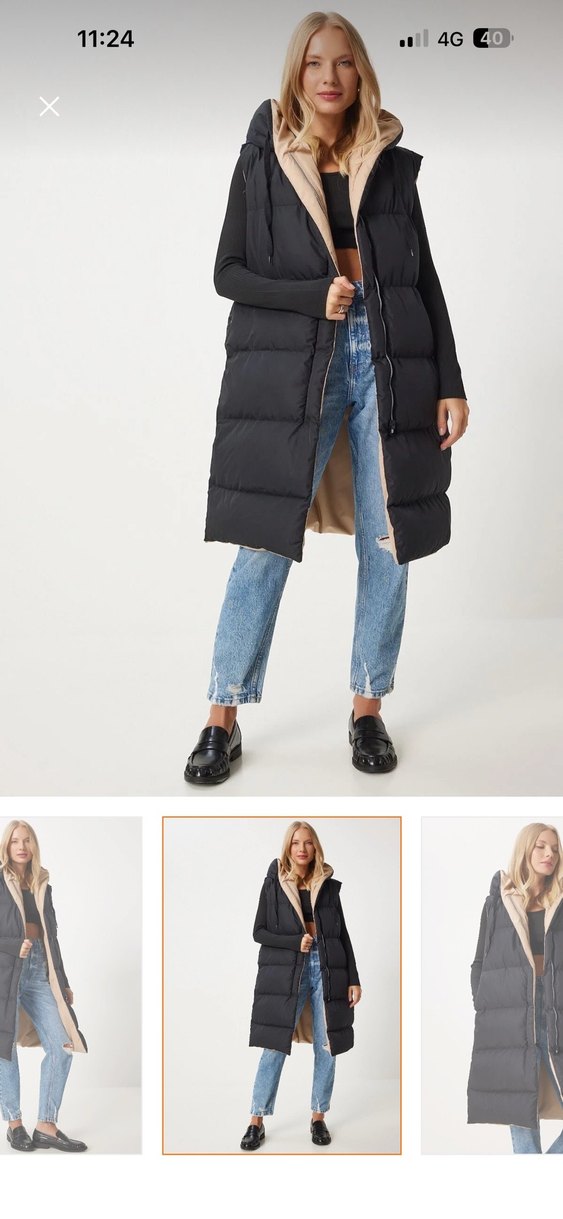 Uzun siyah şişme yelek, kesik yakalı ve kolsuz tasarımıyla denim kumaştan, kürk detaylıdır. Rahat kesimi ve gündelik kullanıma uygundur.