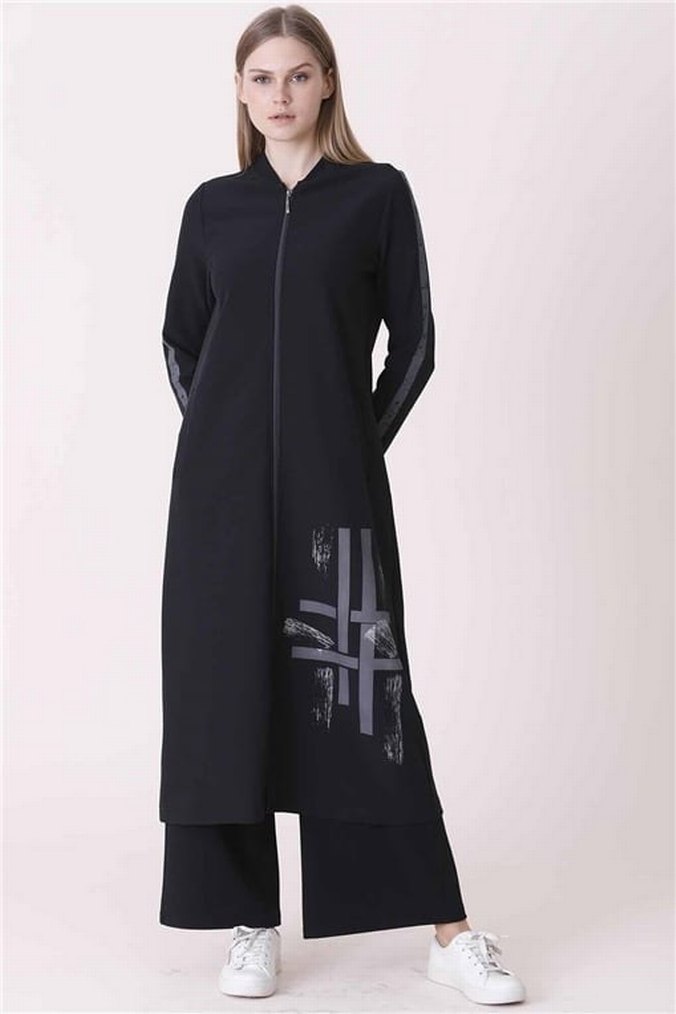 Uzun Siyah Kadın Spor Tarz Eşofman