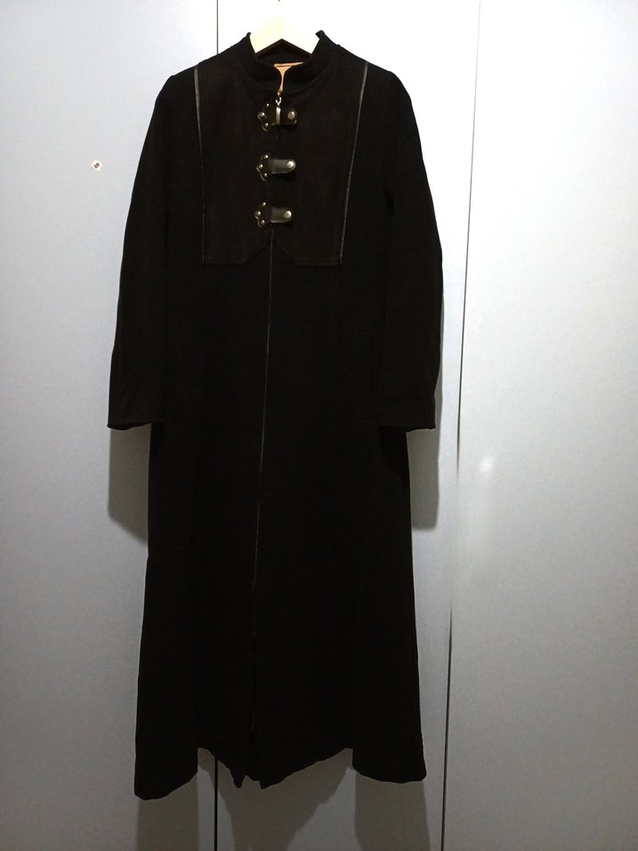 Uzun siyah süet-kaşe kaban, A kesim. Fermuarlı ve üst bölüm çıt çıt süet detay , arka sırt kısmı süet püskül detay, cepli ve gotik tarzda bir kaban.