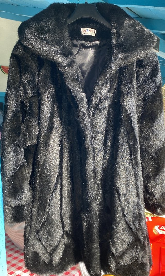 Uzun, bol kesim kadın kaban, siyah ç yumuşak kumaş ve kürk detaylıdır. Notlu yaka ve uzun kolludur, desen içermez, parti için uygundur. ❄️