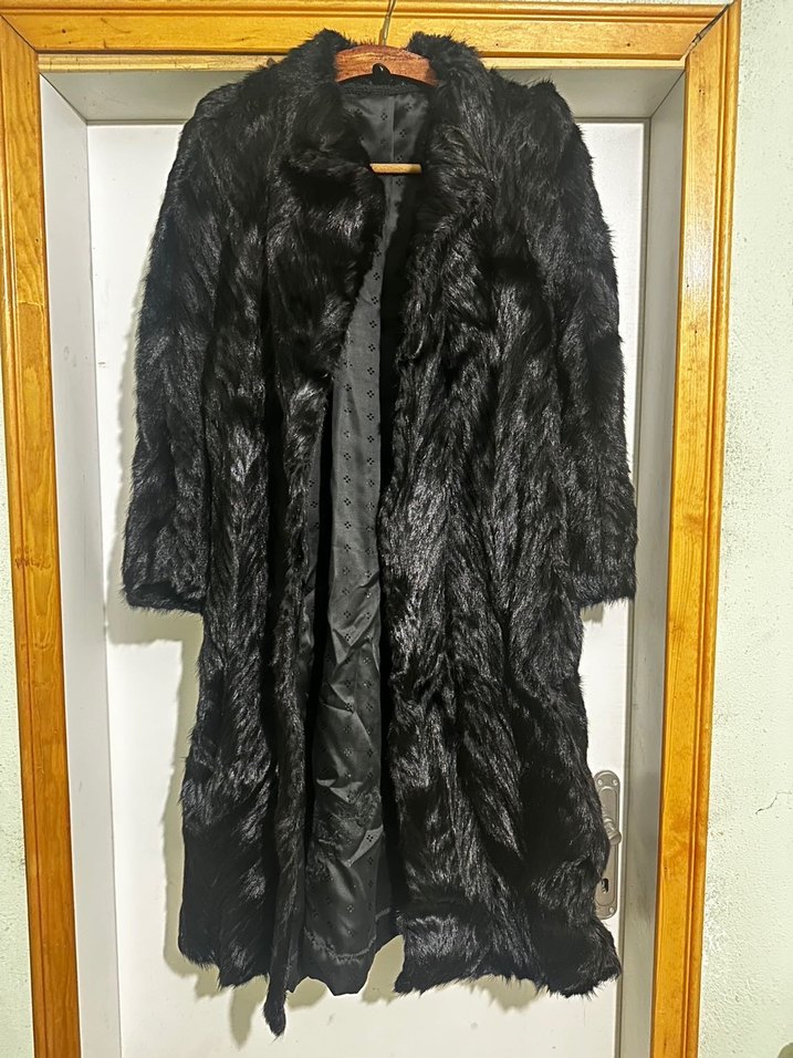Uzun siyah kadın kaban, suni kürk detaylı, uzun kollu ve yakası notch kesimdir. Ofis kullanımı için uygun, fitted kesim ve yumuşak sentetik kumaştan yapılmıştır.