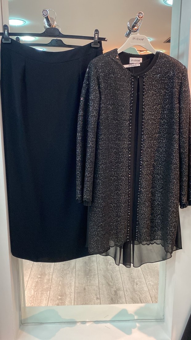 Uzun siyah etek ve drapeli, parlak detaylı uzun kollu, yakalı ceket içeren kadın takımı. Sentetik kumaştan, klasik ve çağdaş tarzda, ofis için uygun. ✨Firma ürünü etiketli 44/46 beden uyumlu