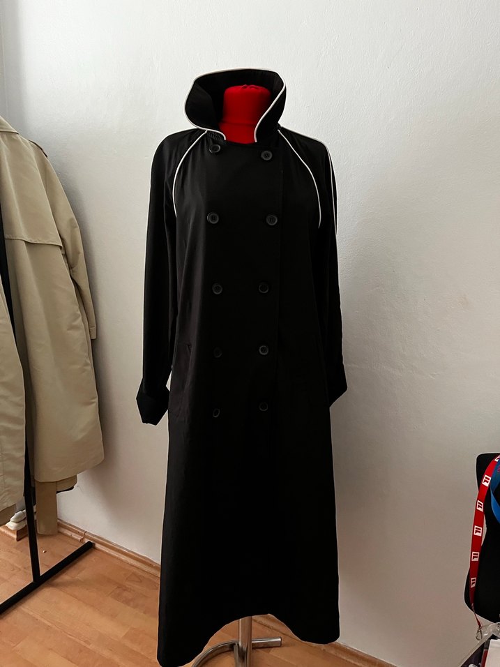 Uzun siyah trençkot, yakası kesik ve drapeli tasarıma sahip. Yumuşak ve sıcak kumaştan, regular fit ve uzun kollu, günlük kullanım için uygun tarzda.