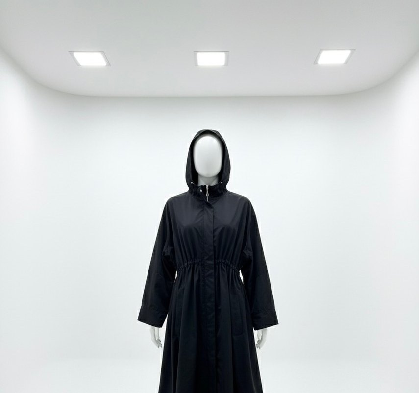 Uzun, siyah renkte kadın yağmurluğu, yüksek yakalı ve drapeli tasarıma sahiptir. Sentetik kumaştan üretilmiş, bol kesim ve kapüşonludur. Minimalist gotik stil, günlük kullanım için uygundur. Standart beden