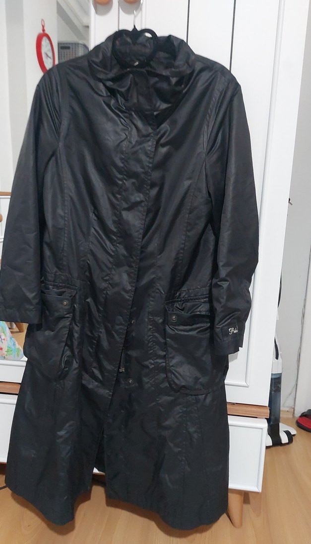 Saten dokulu, uzun siyah yağmurluk, kemerli ve dar kesimdir. Notlu yaka ve düz deseniyle gotik sokak stiline uygundur. Uzun kolludur. ️