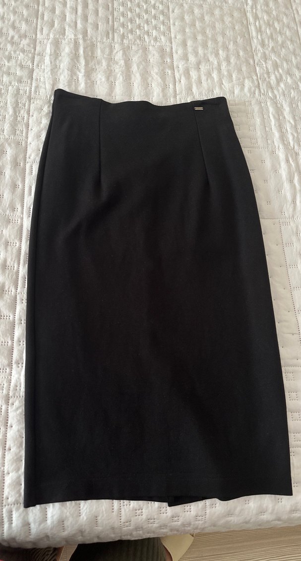 Siyah uzun kalem etek, piliseli ve sentetik kumaştan, klasik şıklık için ofis ortamına uygundur.