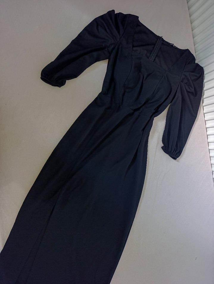 Uzun siyah elbise, oturan kesimi, drapeli tasarımı ve kate yakası ile avangart tarzı yansıtıyor. Uzun balon kollu, desen içermeyen kumaştan. Kare yaka, dirsek altı puf kollu, dar kesim midi boy elbise. Göğüs kısmı pedlidir. Diz hizasına kadar şık yırtmaç detayı mevcuttur. Özel günler, düğün/nişan ve davetler için harika ve çok zarif bir seçimdir.