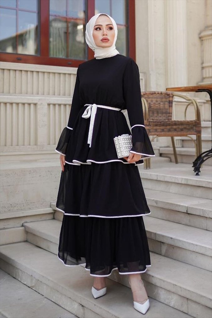 Uzun siyah elbise, katlı volan detayları ve beyaz şeritlerle süslenmiş yüksek yakaya sahiptir. Beyaz kemeriyle bel vurgulanır, günlük kullanıma uygundur.