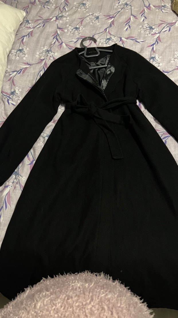 Uzun siyah kaban, kemerli ve kesimli yakalıdır. Sentetik kumaştan üretilmiş, klasik zarafeti yansıtan gotik tarzda, ofis için uygundur.