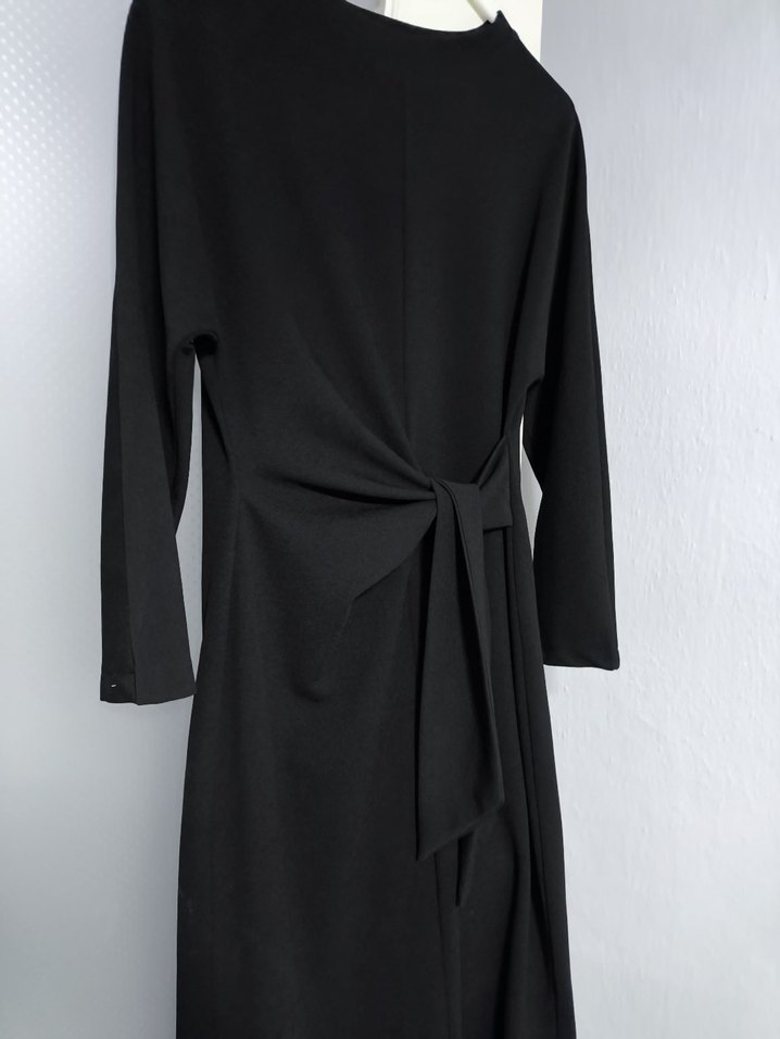 Minimalist uzun siyah elbise, yüksek yakalı ve kemerli. Düz siyah, sentetik kumaştan, ofis için uygun, modern ve şık görünümlü.