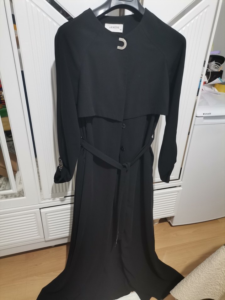 Uzun siyah elbise, yakası notlu ve uzun kolludur. Kemerli bel detayı klasik kesimle birleşir.kemer ve kol uçlarında taş detaylı