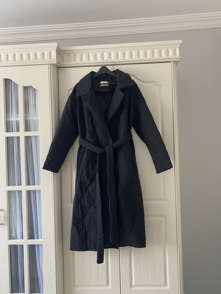 Uzun siyah kaban, kemerli yaka detaylıdır. Salaş kesimi ve askılı kollarıyla minimal ve normcore tarzı için uygundur.