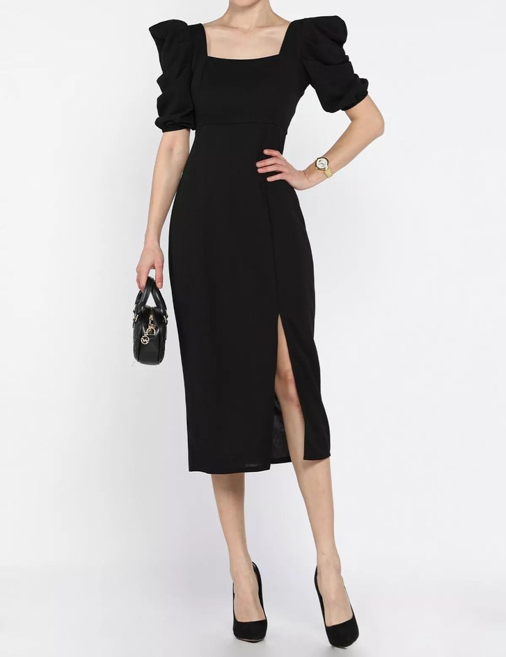 Uzun siyah kalem elbise, kemerli ve straplez yakalı, satenimsi kumaştan. Ofis için uygun, klasik ve şık bir tasarım. Yırtmaçlı, fit kesim. M-L BEDEN 1 kez giyildi