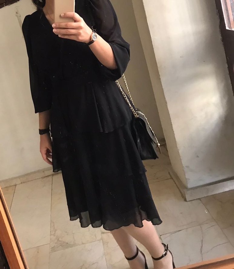 Uzun siyah elbise, V yaka ve kemerli bel detayına sahiptir. Strappy uzun kollu ve bol kesimdir, ofis için uygun klasik şıklıkta.