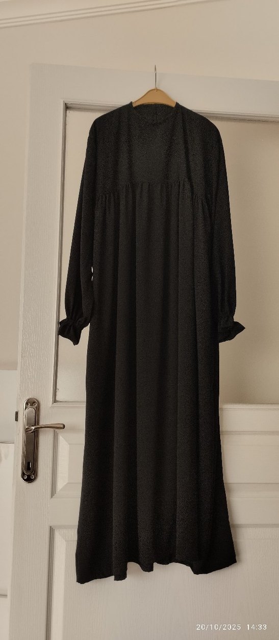 Yüksek yakalı, uzun kollu, keten kumaştan yapılmış, bol ve drapeli siyah uzun elbise. Gotik tarzıyla sade ve mütevazı bir görünüme sahip.