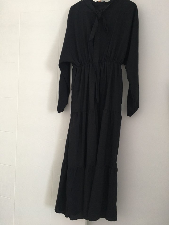 Uzun siyah keten elbise, salaş kesim, drapeli detaylar, yüksek yakalı ve askılı kollu, sade günlük kullanım için uygundur.