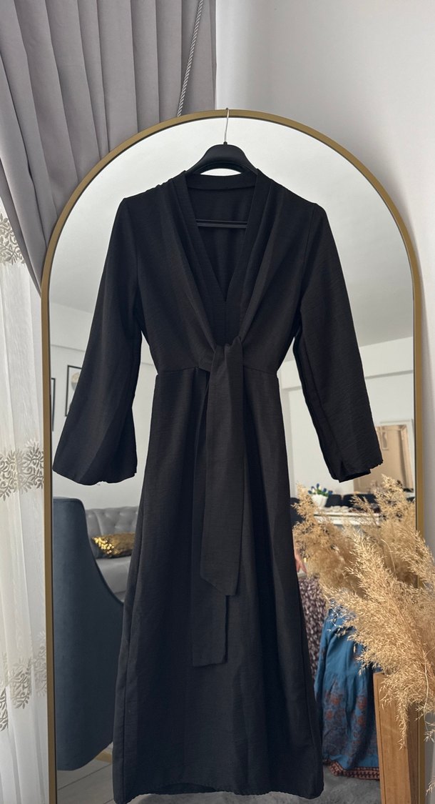 Uzun siyah keten elbise, V yaka ve uzun kollu drapeli tasarıma sahiptir. Ofis için klasik şıklık sunar.