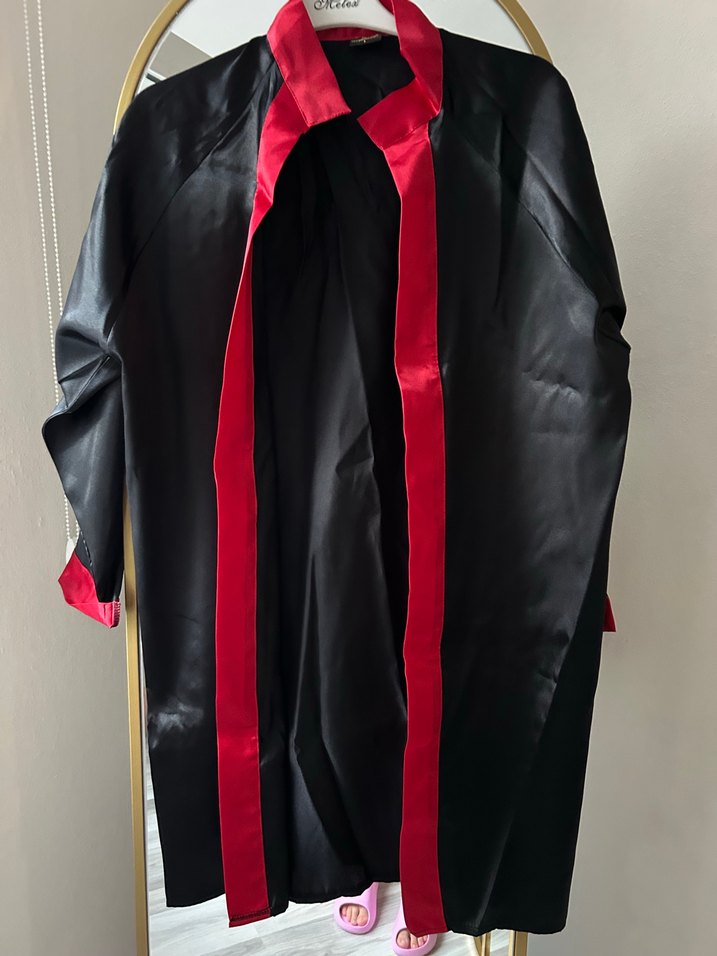 Uzun siyah elbise, kırmızı detaylı, drapeli ve kesik yakalıdır. Uzun kollu, regular fit ve ofis ortamına uygun gotik tarzda bir mezuniyet elbisesidir.