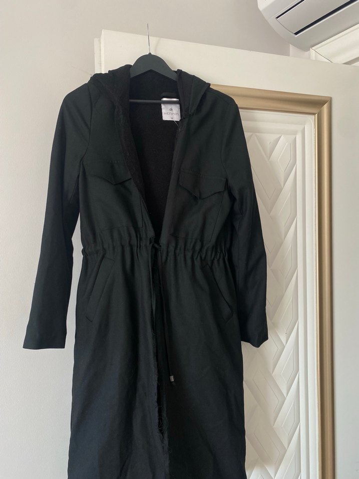 Uzun siyah kadın ceketi, yakalı ve uzun kolludur. Belden kemerli, minimalist ve günlük kullanım için uygundur. Terzide fermuar yok dikilecek