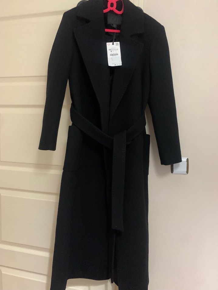 Uzun siyah kaban, geniş yakalı ve kuşak detaylı klasik tasarıma sahiptir, rahat ve şık kombinlere uygundur.