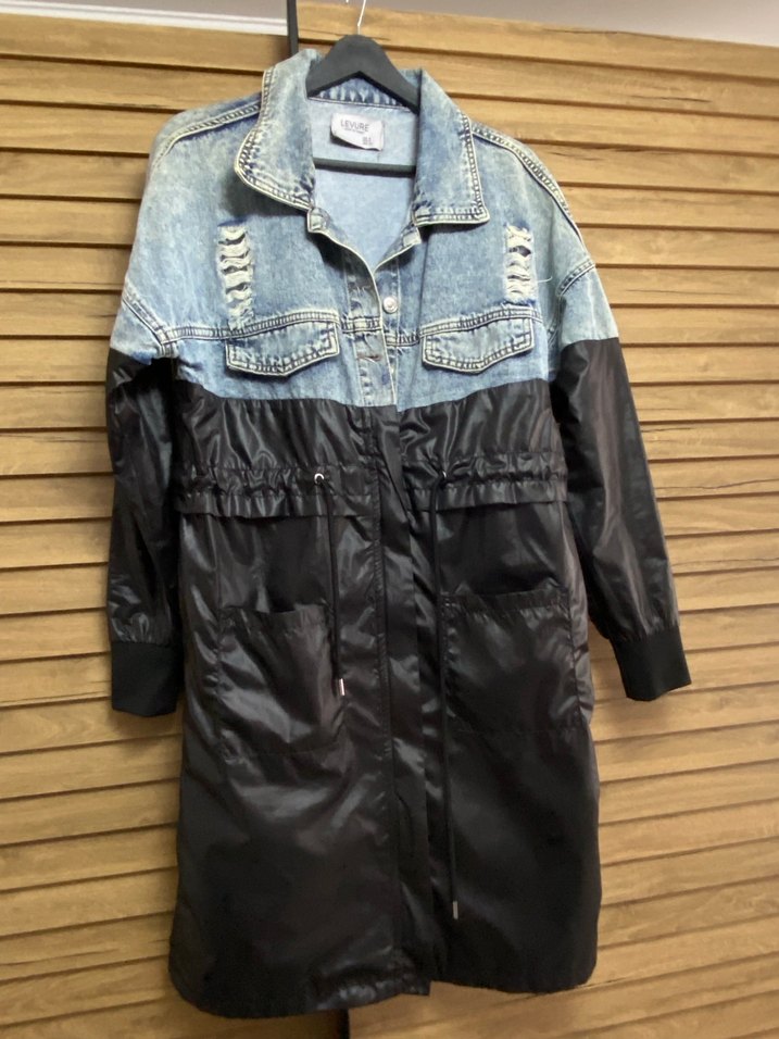 Uzun, bol kesim siyah kot ceket, kemerli bel ve uzun kollu. Notlu yaka ve batik desen detaylarına sahip, sokak stili için uygun.