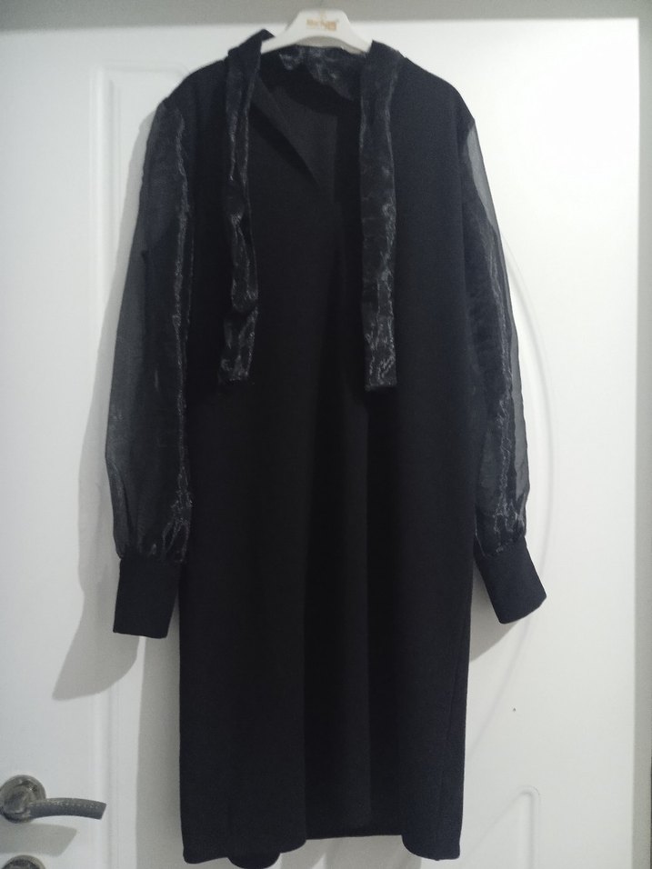 Uzun siyah elbise, yüksek yakalı ve uzun kollu, kürk detaylı, regular fit ve gotik tarzda, ofis kullanımı için uygundur.