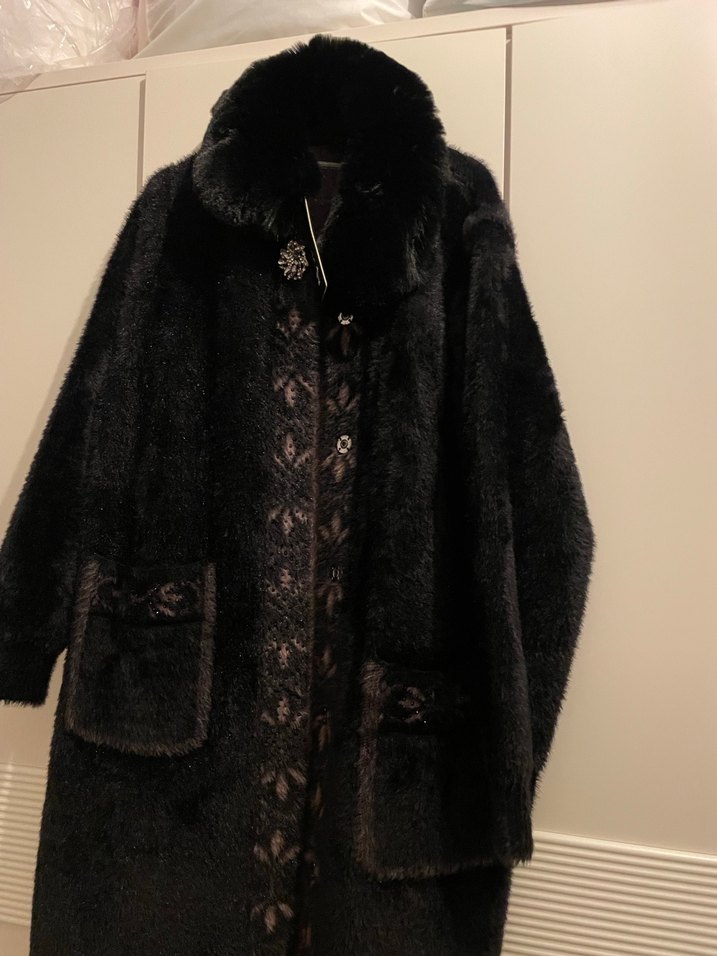 Uzun siyah suni kürklü kaban, işleme detaylı ve kesik yaka ile tasarlanmıştır. Bol kesim, uzun kollu ve cep detaylıdır, rahat ve gotik tarzı bir arada sunar.