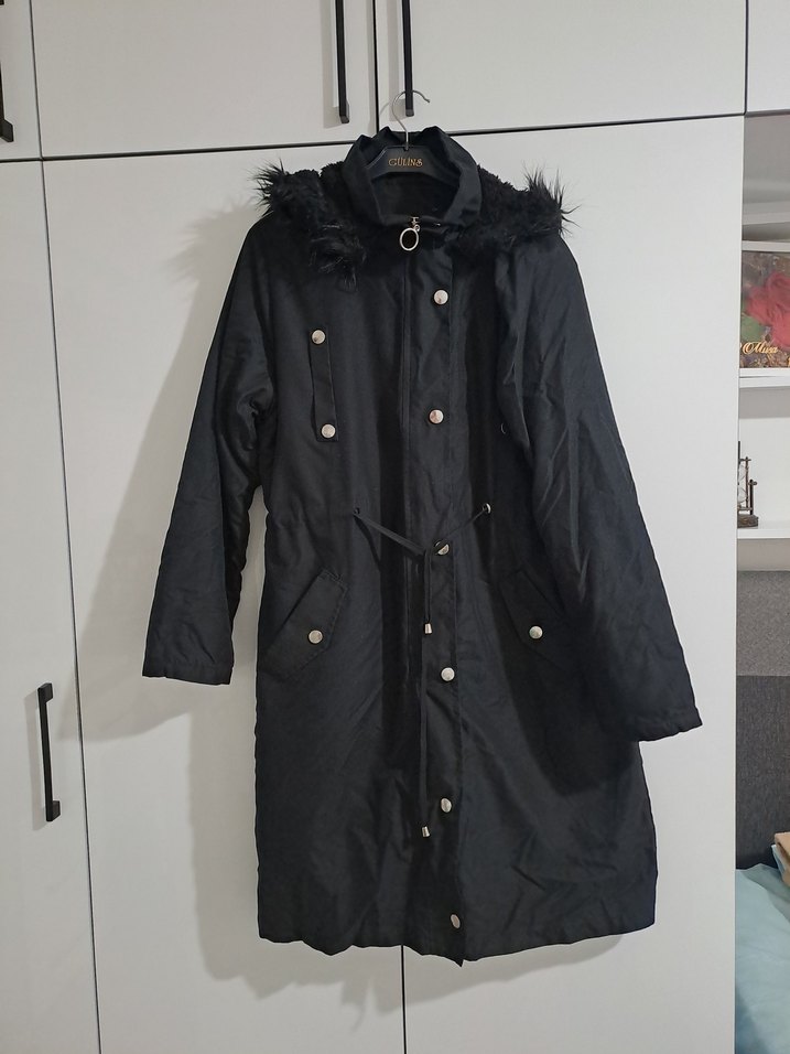 Kürklü detaylı, uzun siyah kadın mont. Yumuşak ve sıcak kumaştan, kesimi vücuda oturur, günlük kullanıma uygun goth tarzında.