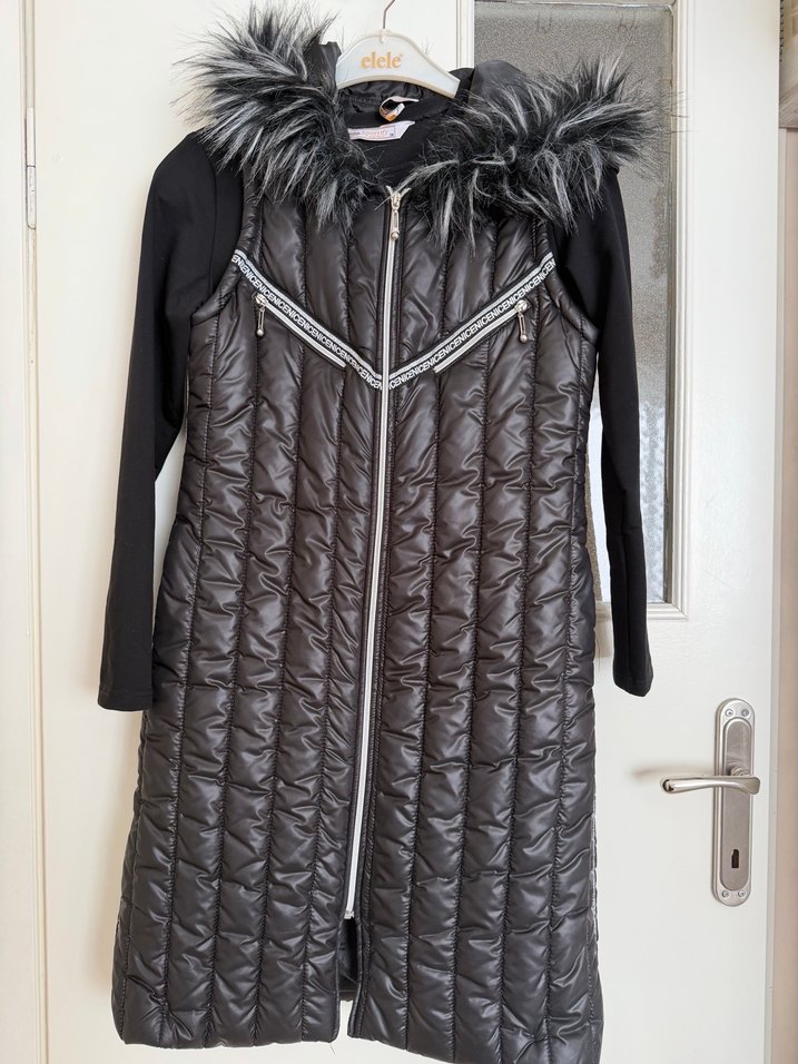 Uzun siyah yelek yüksek yakalı,, vücuda oturan kesime sahiptir. Kapüşonunda kürk detayları bulunur ve yumuşak sentetik kumaştan yapılmıştır, günlük kullanıma uygun rahat ve modern bir görünüm sunar. Pantolonunda yer yer yıpranma mevcut fiyat ikili şekilde sunulmuştur (pantolon yığrandığı için ücretlendirilmeyecektir ama satışa hazırdır)