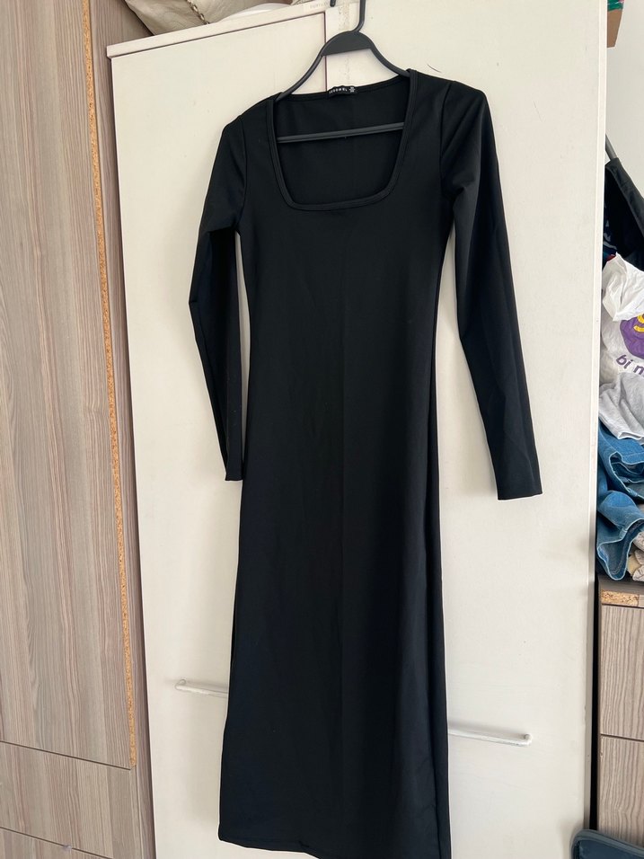 Uzun, siyah, dar kesim elbise; uzun kollu ve kare yaka detaylıdır. Düz, sentetik kumaştan yapılmış, minimalist gotik stile sahiptir.