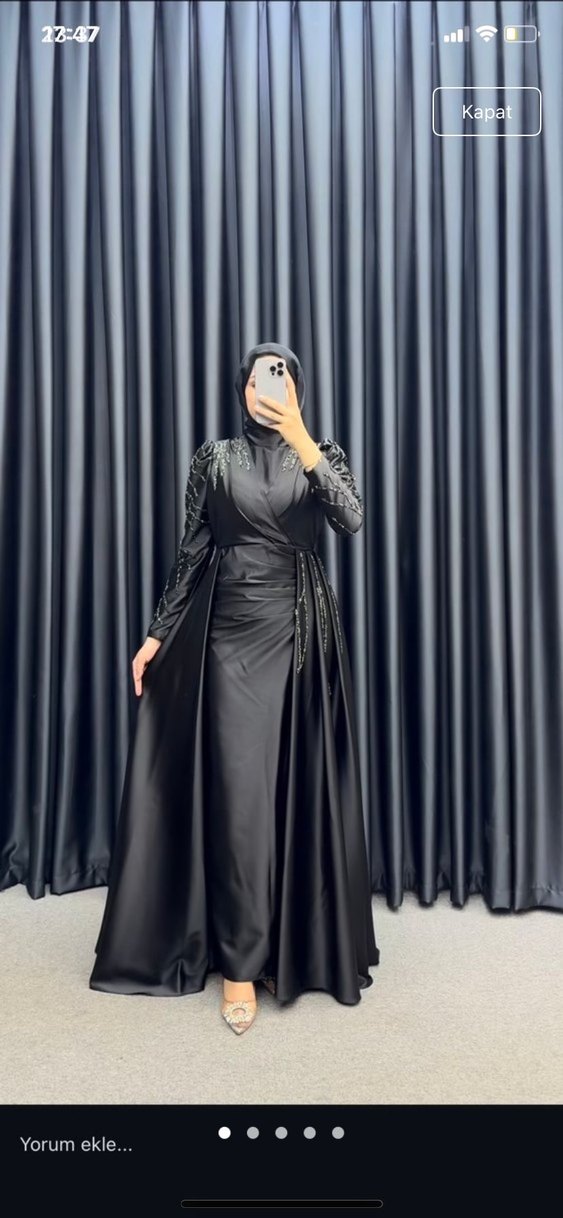 Yüksek yakalı, uzun kollu, nakış detaylı ve drapeli siyah, oturan kesim abiye elbise, düğünler için uygundur. Sadece bir kere giyildi tertemiz abiye