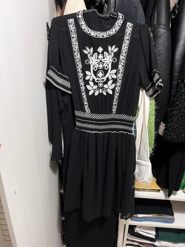 Uzun siyah elbise, nakışlı çiçek desenleri ve yüksek yakaya sahiptir. Uzun kollu, bol kesim ve drapeli tarzda, günlük kullanıma uygundur. Cok güzel