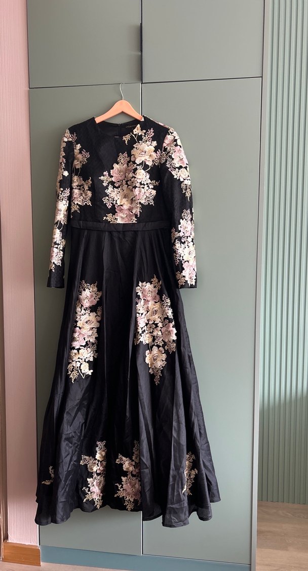 Uzun siyah elbise, nakışlı çiçek desenleri, bol ve drapeli kesime sahiptir. Uzun kollu, tekne yaka olup vintage bohem tarzını yansıtır, düğünler için uygundur.