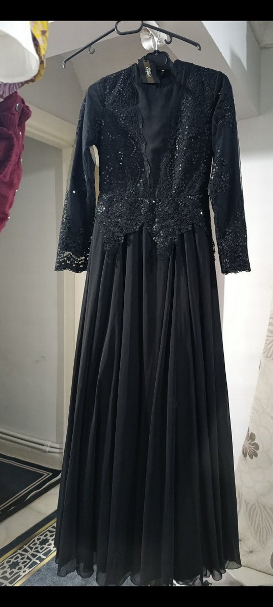 Uzun siyah abiye elbise, v yaka ve uzun kollu, nakışlı detaylara ve drapeli tasarıma sahiptir. Gotik tarzda düğünler için uygundur. 40 beden yazıyor 38 beden o yüzden hiç giyilmedi etiketi üstünde zaten uzaktan alındığı içinde değişim yapamadık maalesef 5.500 alınmıştı