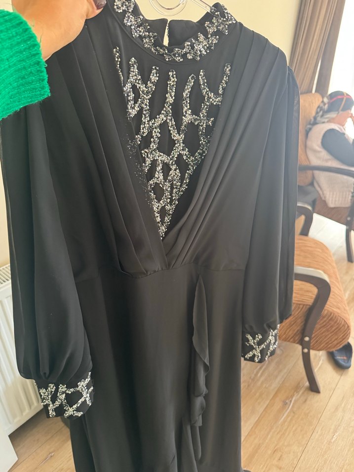 Uzun siyah elbise, V yaka, nakışlı manşetler ve drapeli bol kesim ile gotik ve mütevazı stil sunar. Düğünler için uygundur.
