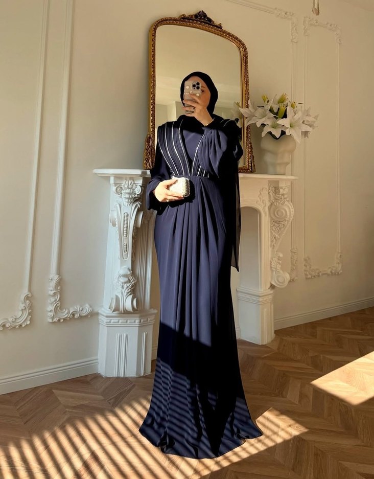 Uzun siyah elbise, yüksek yakalı ve uzun kollu, nakış detaylıdır. Drapeli ve rahat kesim, modest gotik ofis kullanımı için uygundur.
