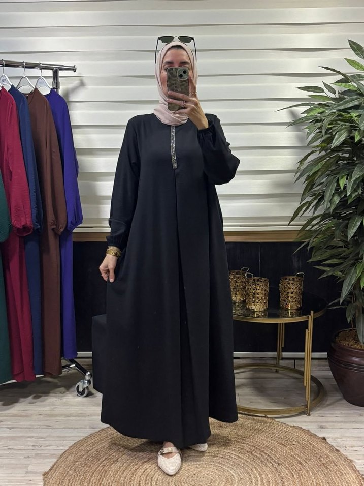 Uzun siyah elbise, yüksek yakalı ve uzun kollu, nakış detaylıdır. İpek gibi kumaştan, bol kesim ve drapeli, günlük kullanıma uygundur.