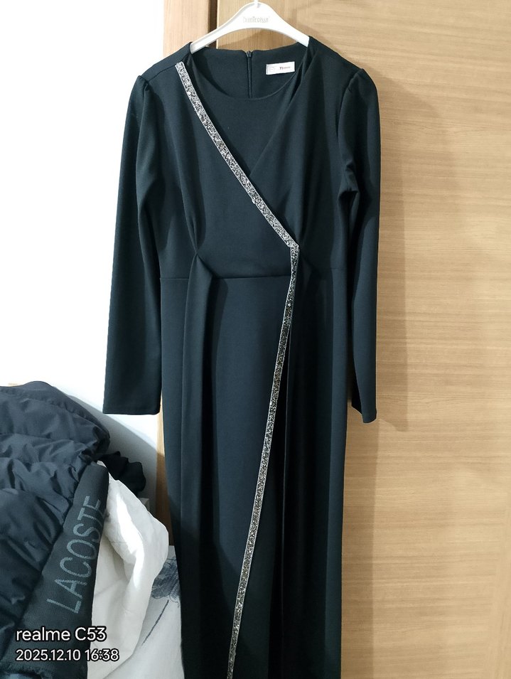 Uzun siyah elbise, drapeli ve nakış detaylıdır. Notlu yaka ve uzun kollu, modern klasik tarzda, ofis için uygundur.