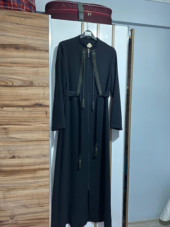 Uzun siyah renkli, nakış detaylı kadın palto. Kemerli, yakası kesik ve askılı kolludur. Sentetik kumaştan, düzenli kesim ve ofis kullanımına uygundur. tekliflere açığım
