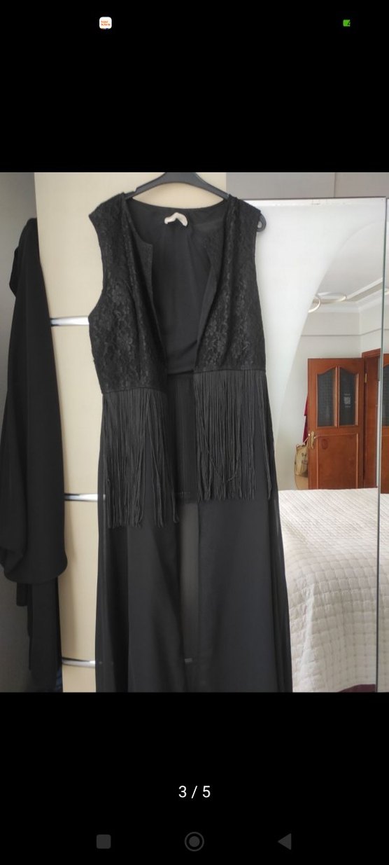 Siyah, nakışlı ve püsküllü detaylara sahip, straplez yaka ve uzun kesim kadın yelek. Gotik ve bohem tarzlarını yansıtır.