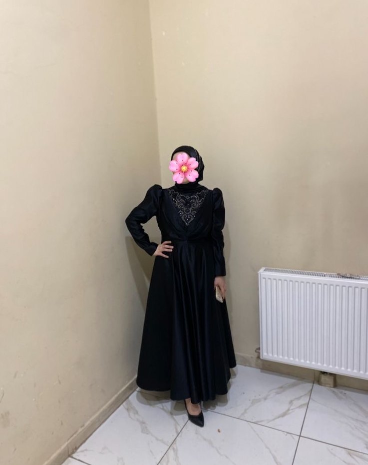 Yüksek yakalı, uzun kollu ve nakış detaylı uzun siyah elbise. Bol kesim ve drapeli kumaşıyla sade tarzı yansıtır, düğün gibi özel günlere uygundur.