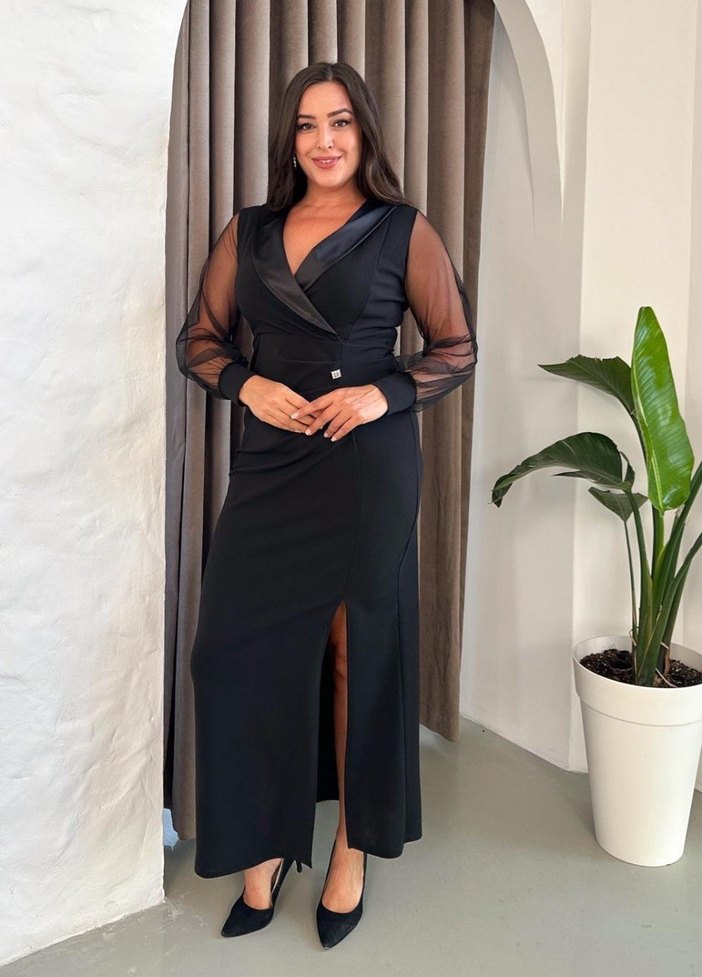 V yakalı, uzun şeffaf kollu ve drapeli detaylara sahip uzun siyah elbise, cesur gotik tarzıyla ofis için uygundur. Düzenli kesim ve ön yırtmaç içerir.