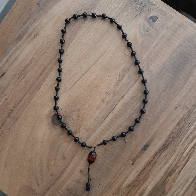 Uzun siyah Onix dogaltastan oluşan, bağlama desenli gotik ve bohem tarzda kadın kolyesi. Günlük kullanım için uygundur.