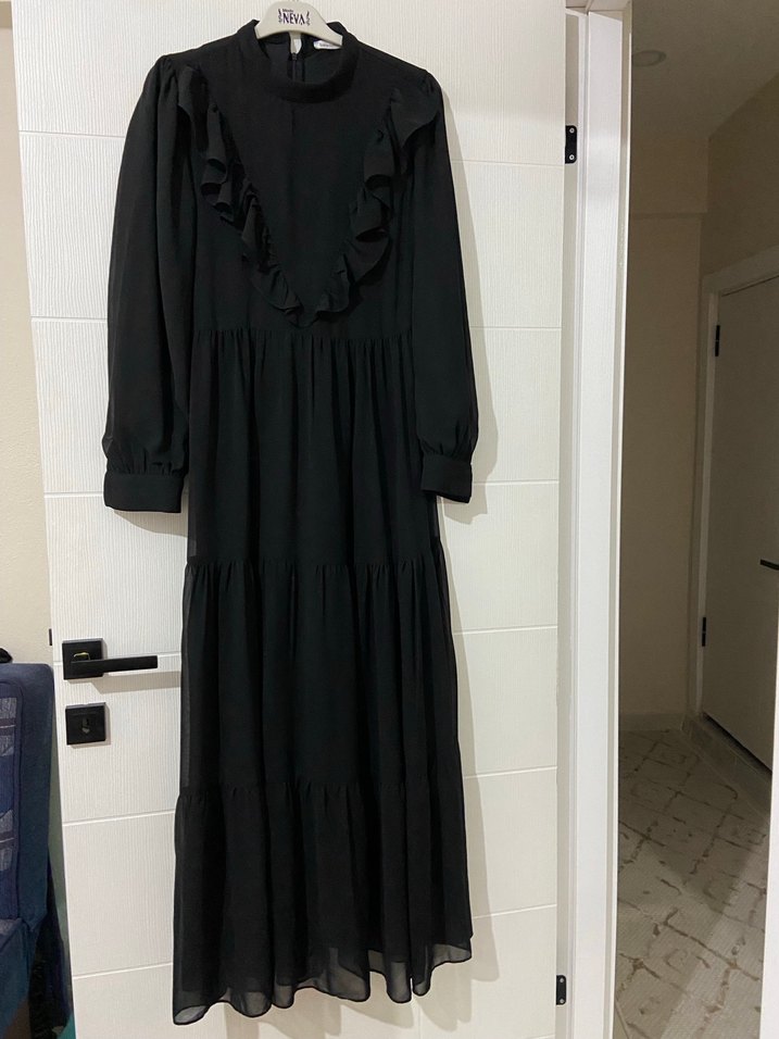 Uzun boy, uzun kollu, yüksek yakalı ve fırfır detaylı siyah Şifon elbise 38 40 bedene rahatlıkla olur Ben 54 kg’da rahatlıkla giydim