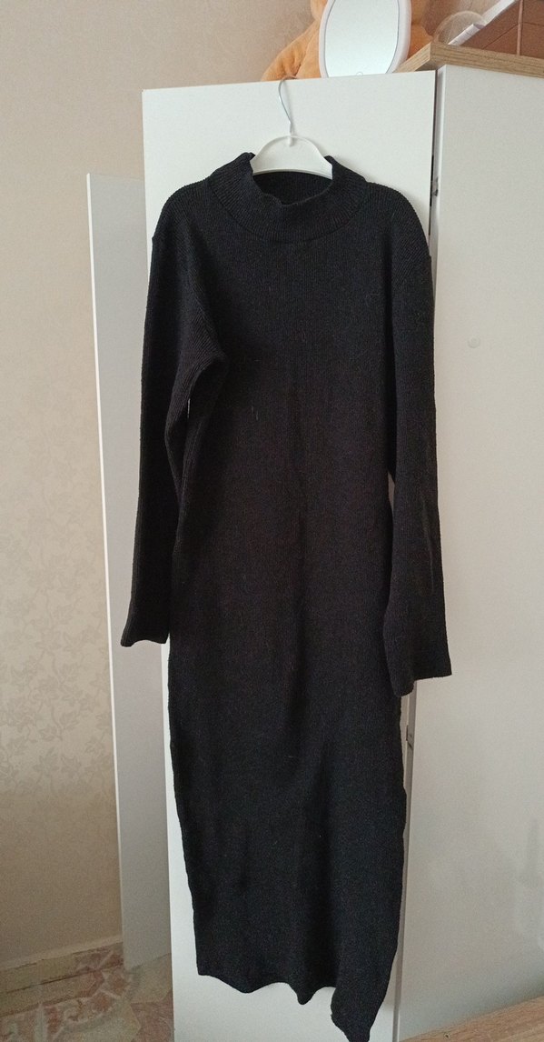Uzun siyah örgü elbise, yüksek yakalı ve vücuda oturan kesimiyle uzun kolludur. Rahat ve şık bir günlük tarz sunar.